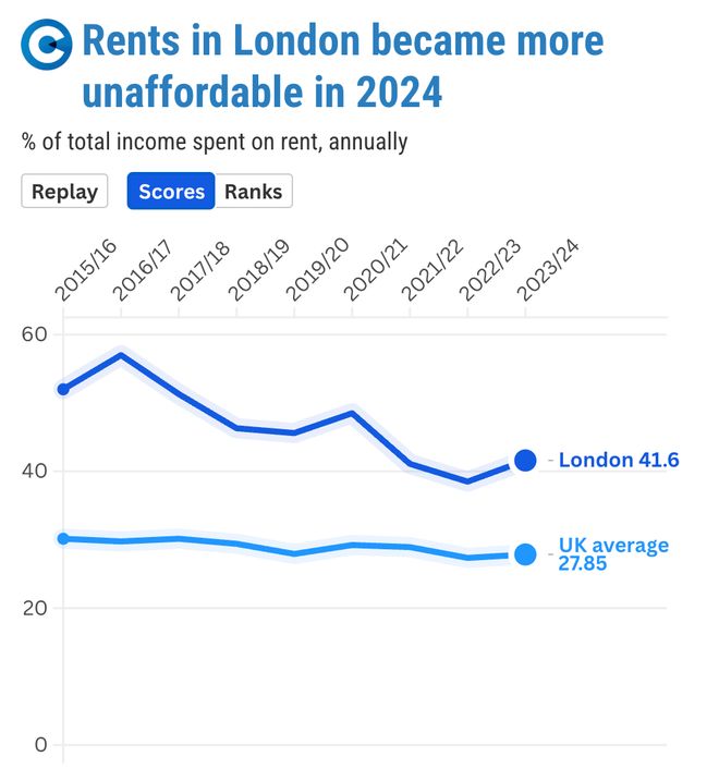 2024年,伦敦地区收入中位数的私人租户将收入的41.6%用于支付房租,较2023年的38%有所上升,并创下自2021年以来的最高纪录。